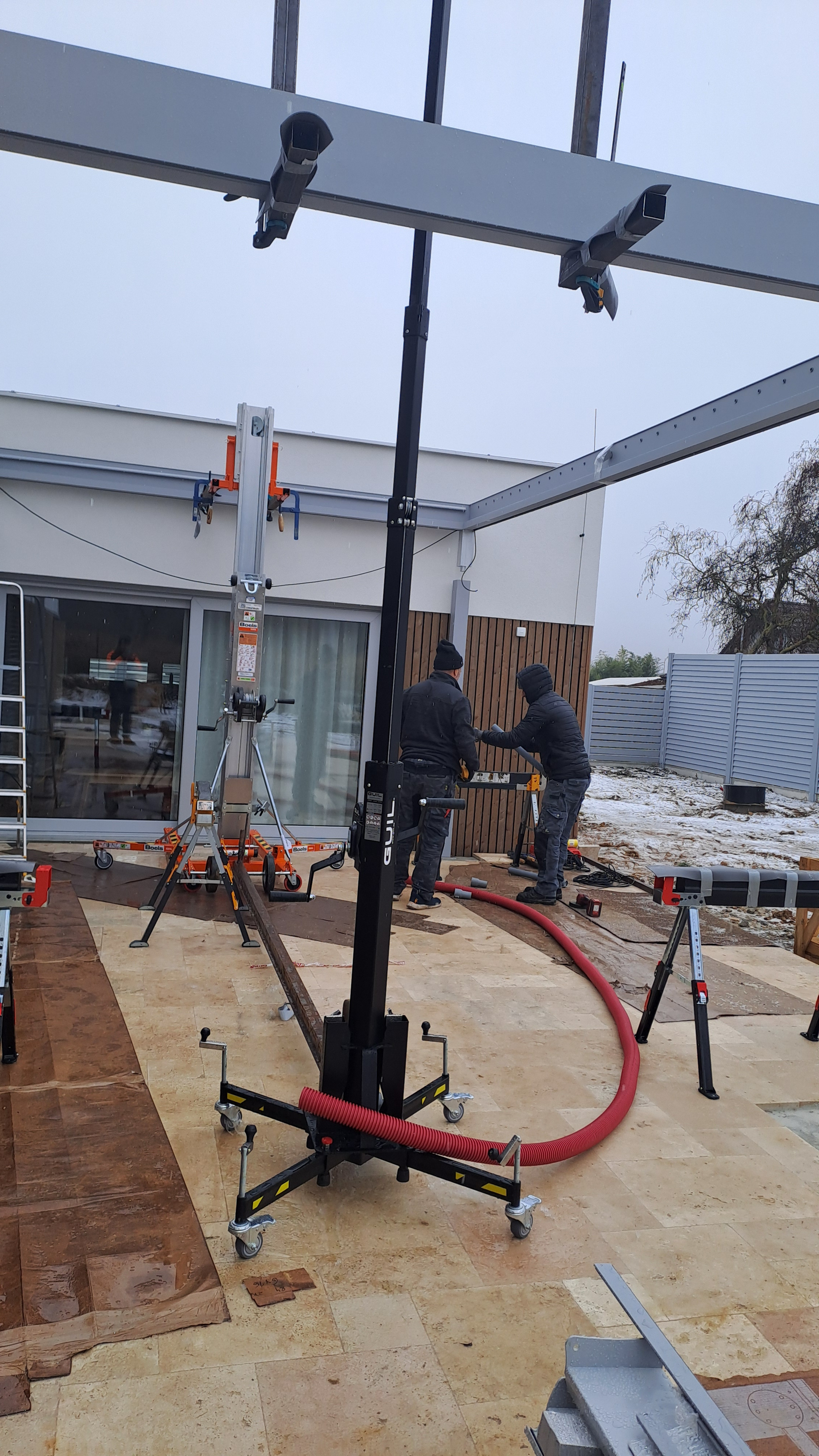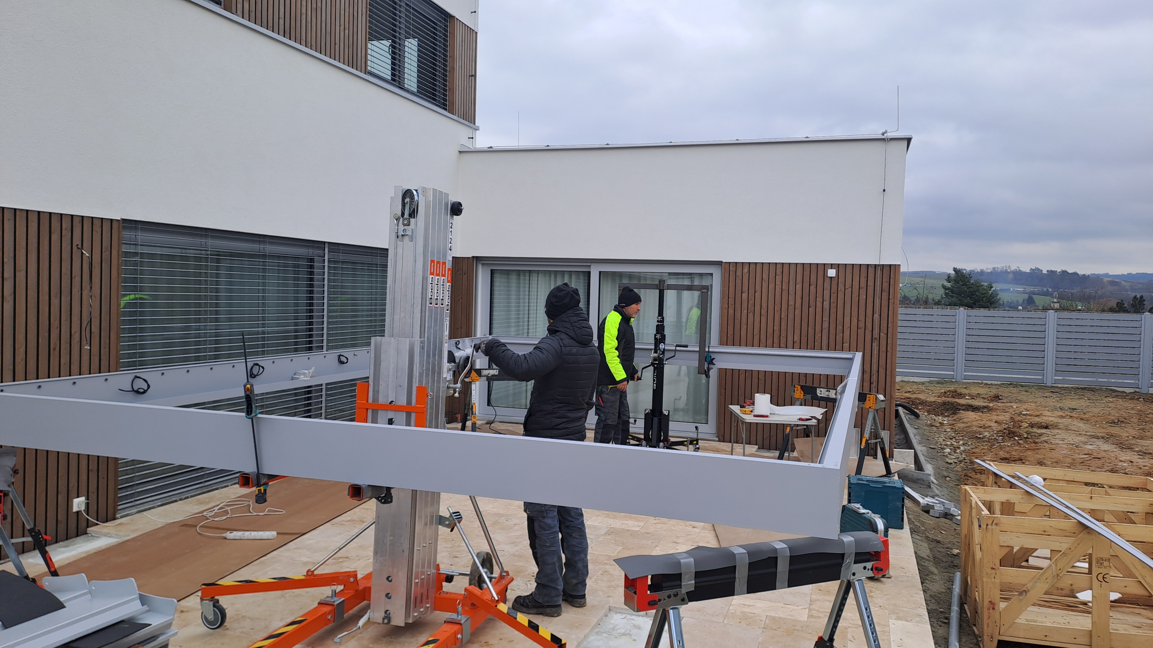 ZDE JE STAVBA BIOKLIMATICKÉ PERGOLY O ROZMĚRECH 6 X 4m.